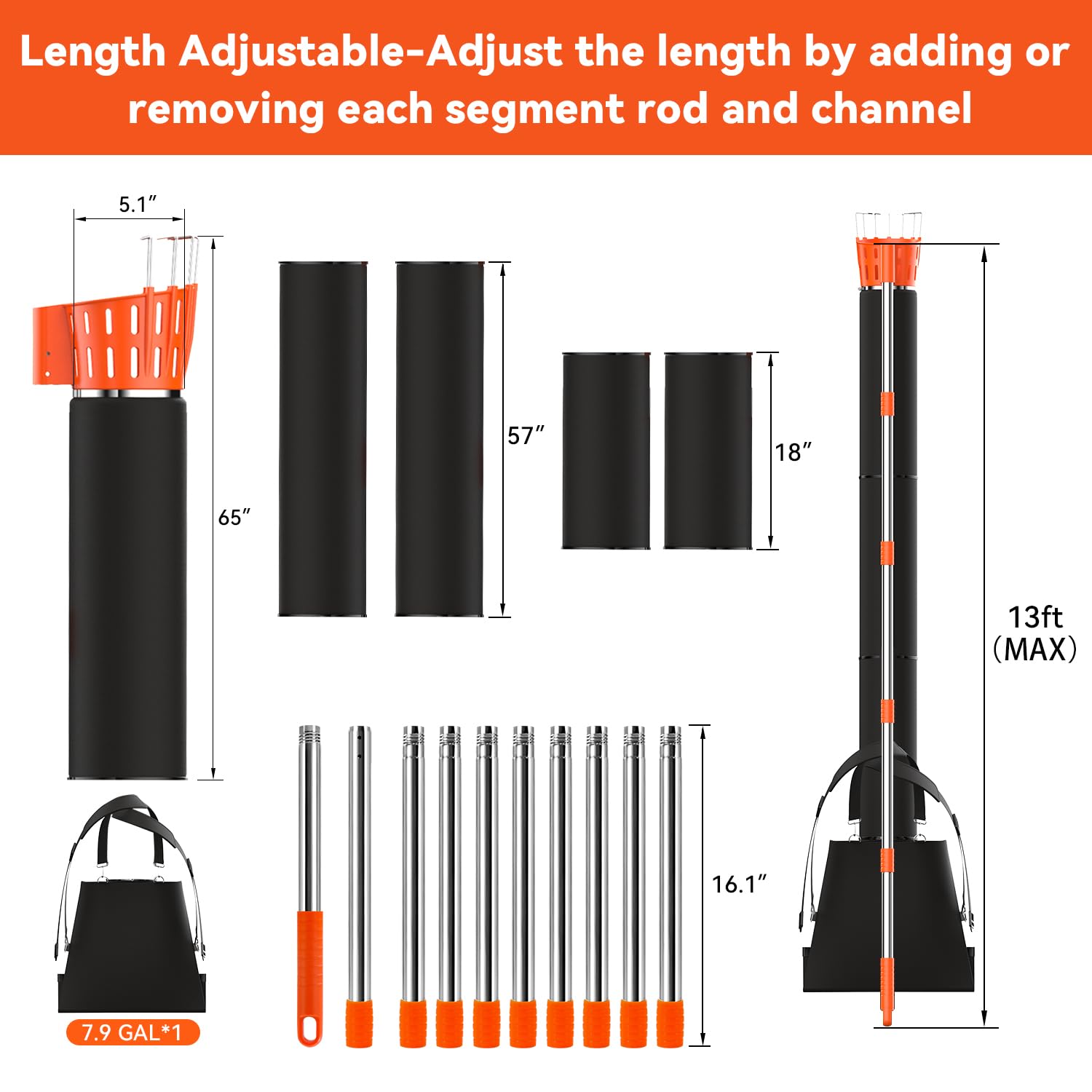 Our fruit picker features 10 extendable rods, each 16.1 inches long, and 5 detachable collection funnels – 2 at 18 inches and 3 at 57 inches. The adjustable length extends up to 13 feet, allowing you to effortlessly pick fruits from tall trees without needing a ladder, ensuring a perfect harvest every time.
