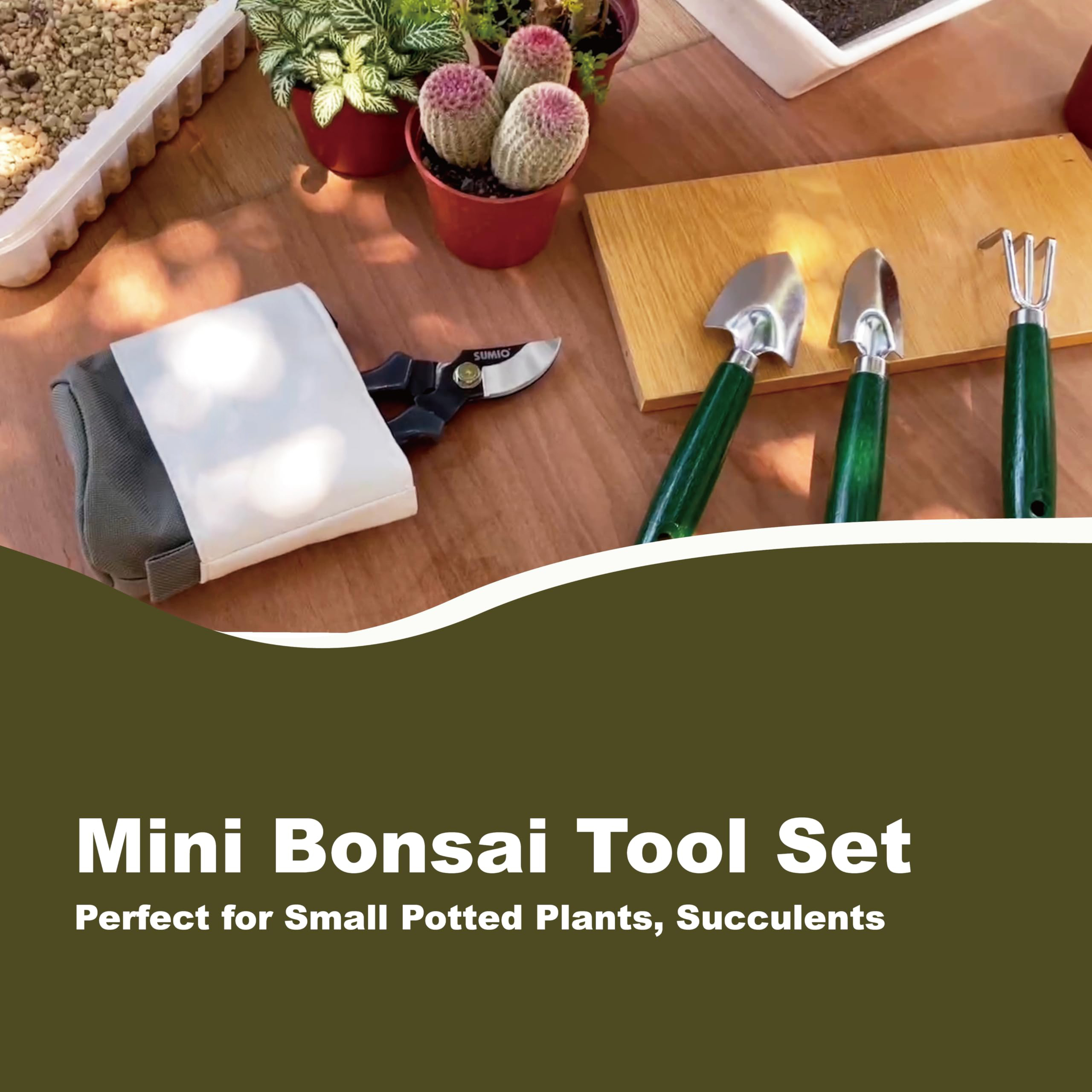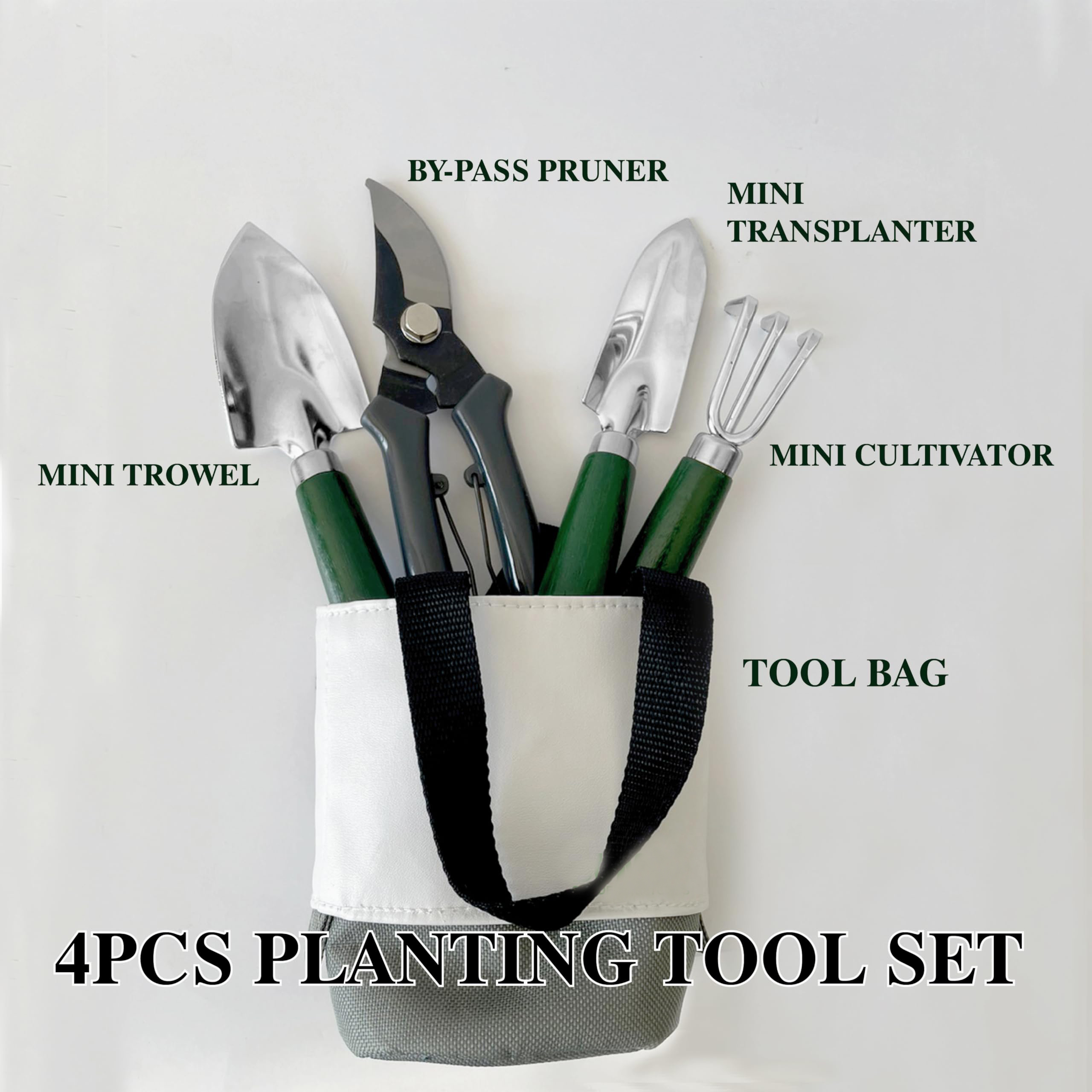 4-piece tool set: includes MINI TROWEL, MINI TRANSPLANTER, MINI CULTIVATOR, and BYPASS SHEARS. This versatile set comes with a convenient storage bag, making it perfect for a variety of delicate indoor or tabletop gardening needs.